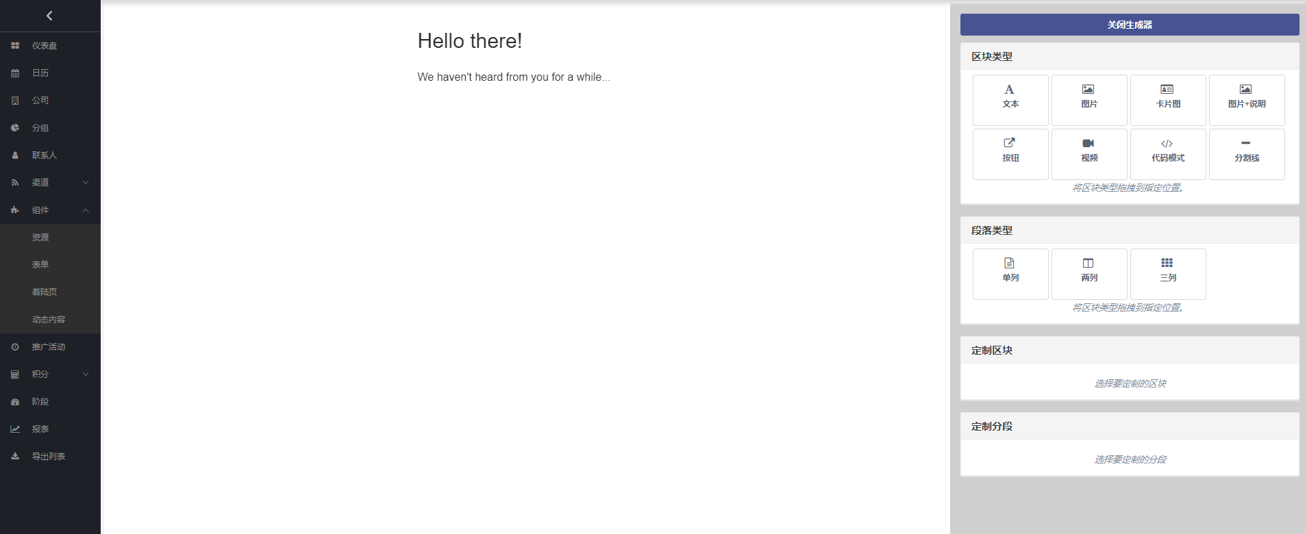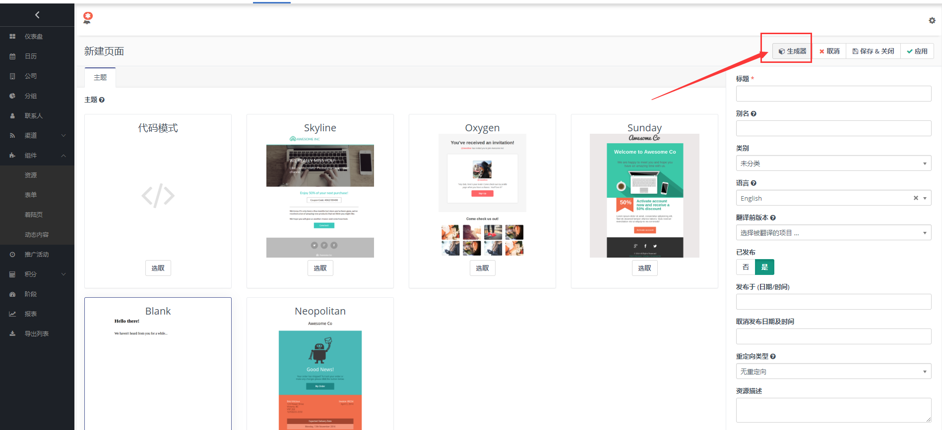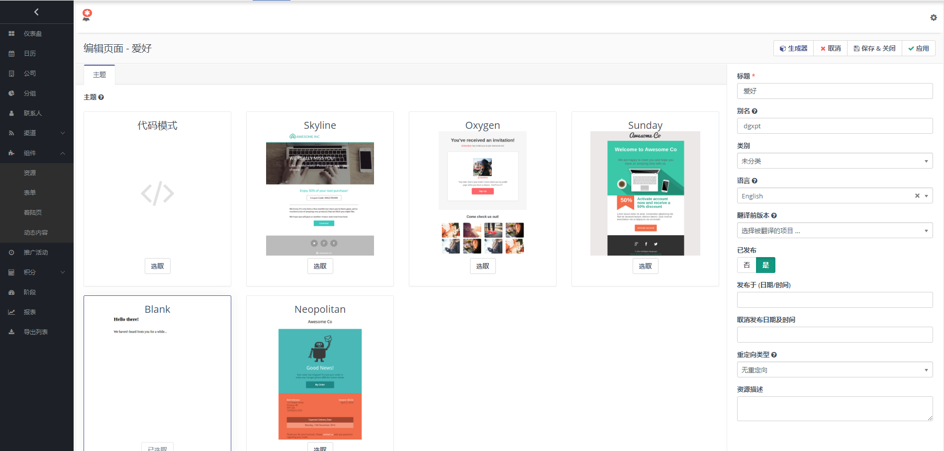 内容名称 类型 必填项 说明 主题 选择 是 着陆页的主题 标题 文本 是 着陆页的标题 别名 文本 否 着陆页的别名 类别 选择 否 着陆页的类型 语言 选择 否 着陆页使用的语言 翻译前版本 选择 否 着陆页翻译前的版本 已发布 选择 否 着陆页是否发布 发布于 (日期/时间) 时间选择 否 着陆页发布时间 取消发布日期及时间 时间选择 否 着陆页取消时间 重定向类型 选择 否 着陆页的重定向类型 资源描述 文本框 否 着陆页的资源描述