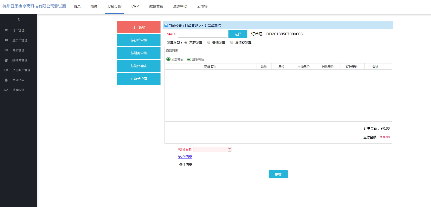 订单新增主要用于手动给客户新增订单