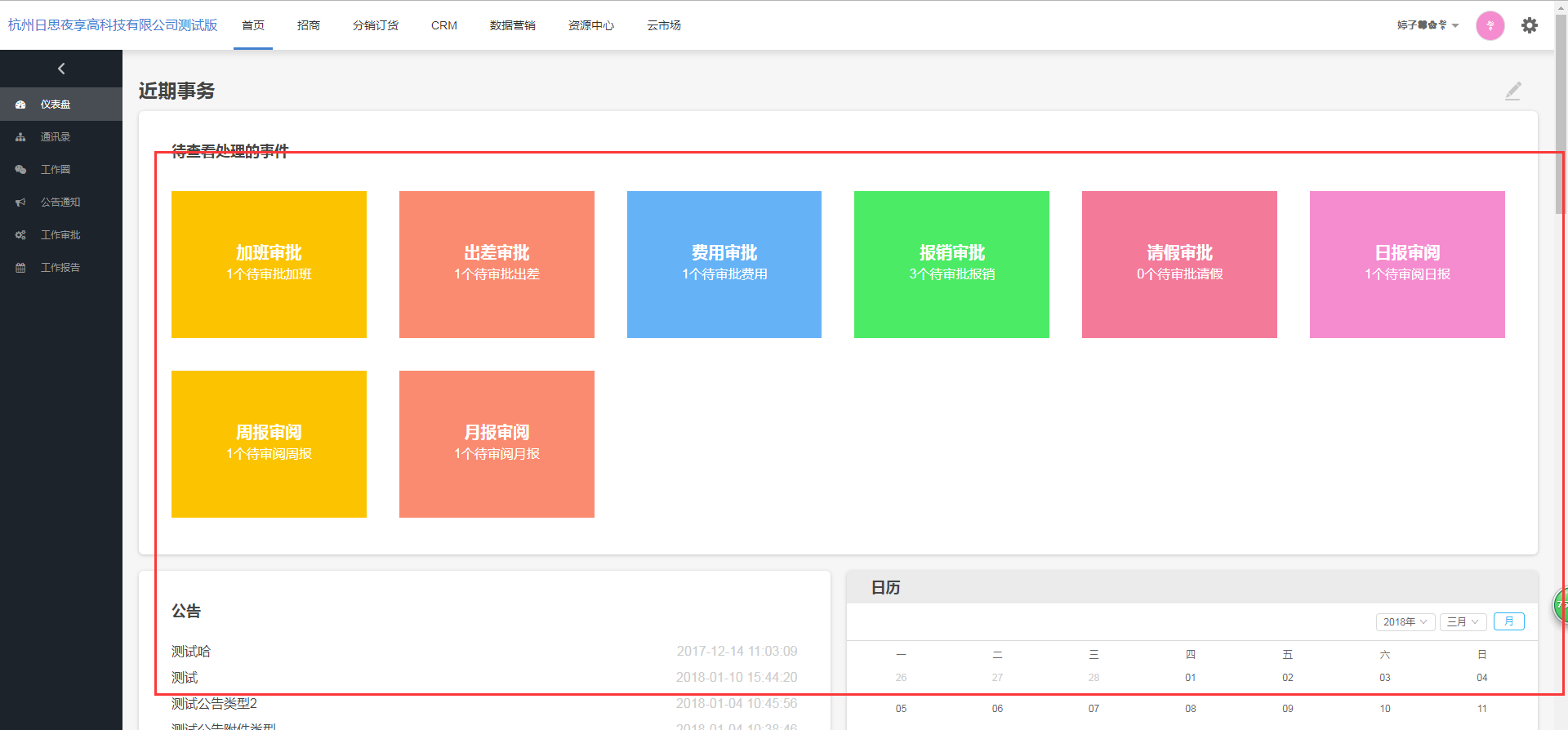 仪表盘是包含待处理的审批事件,公告,日历,数据总览等的使用快捷工具,快速定位到想要发起的工作报告类型以及想要发起的流程,使用人员登录后,可一目了然的查看日报的提交,审阅信息,接收到的公告信息,待处理的审批信息,以及招商统计的报表情况。