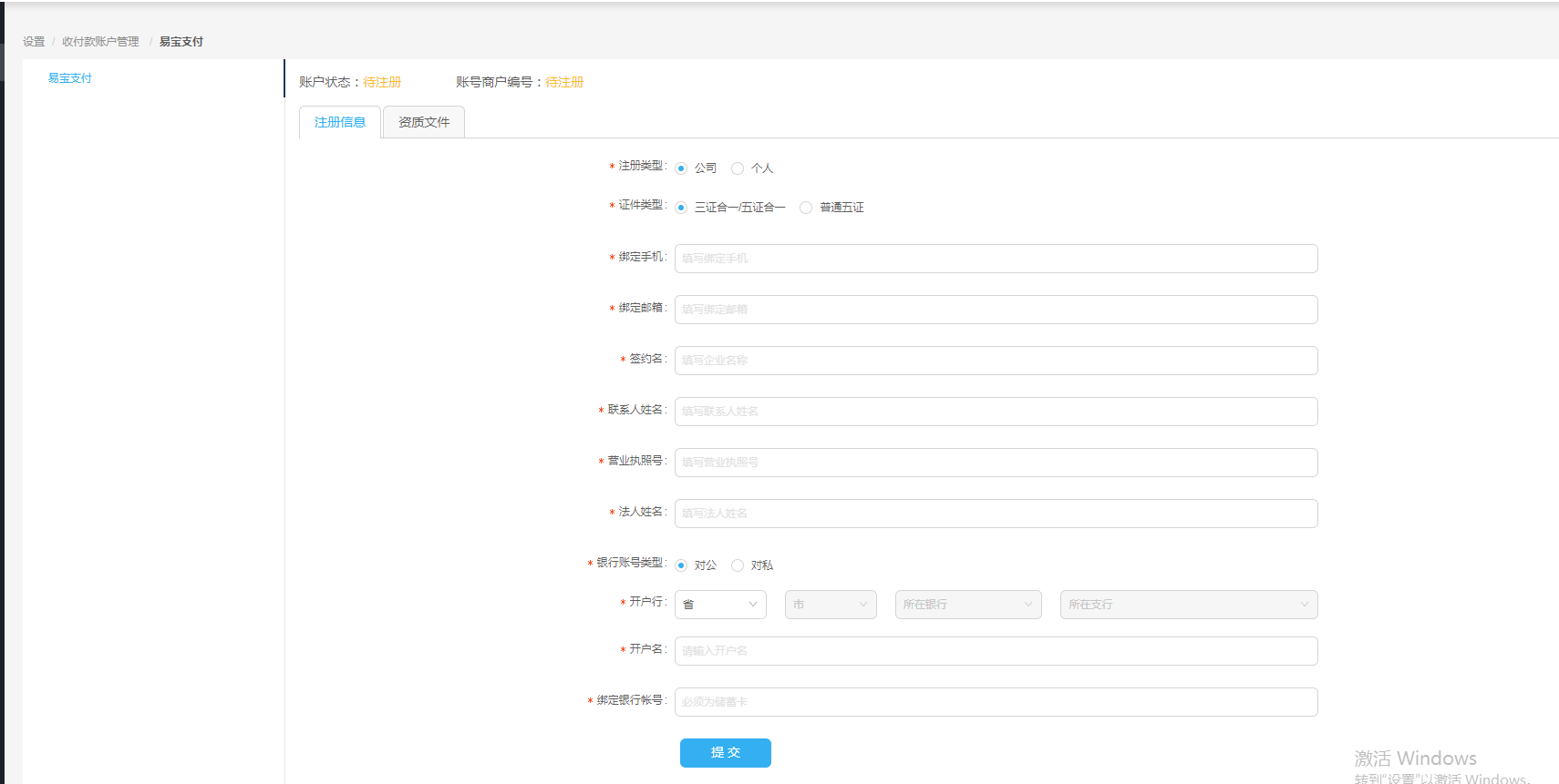 注册信息填写分公司和个人,未提交注册信息,不能进入资质文件界面 对公