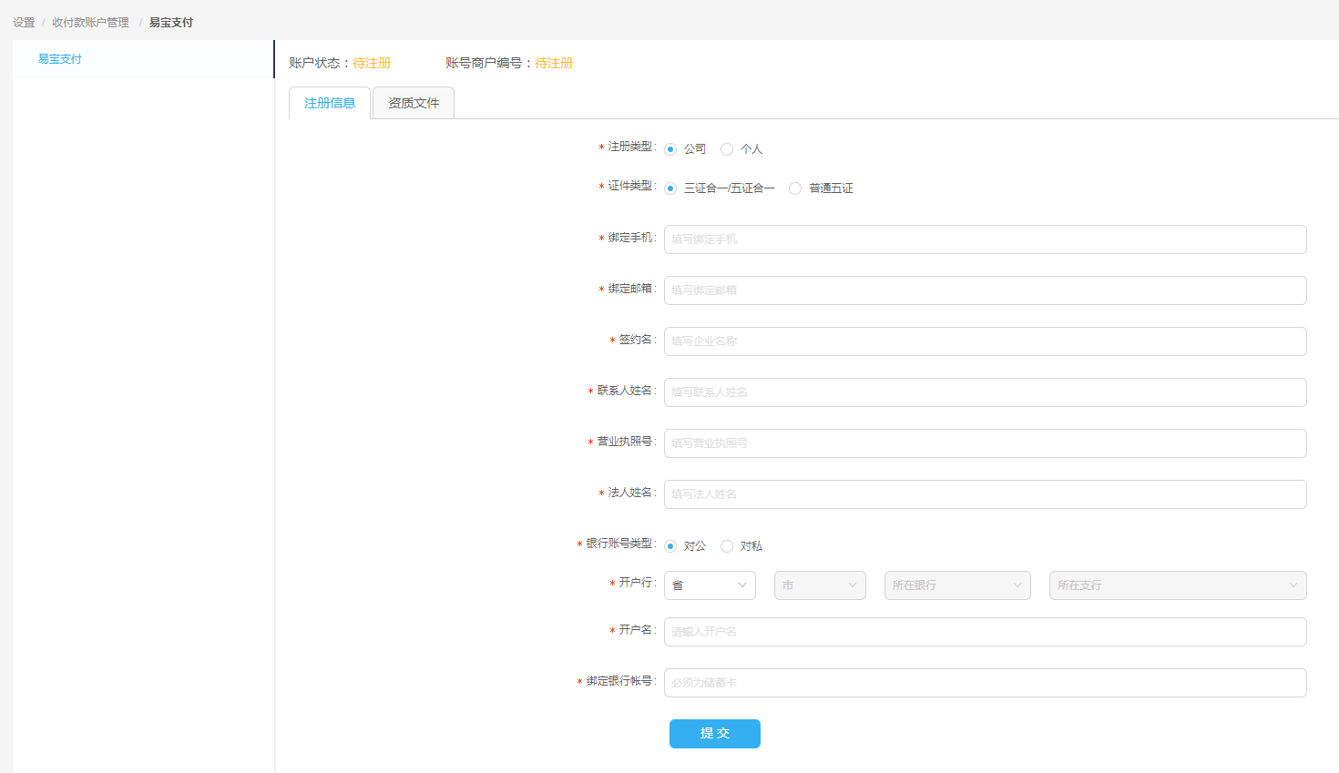 内容名称 类型 必填项 说明 注册类型 单选框 是 注册类型选择公司,属于对公 证件类型 单选框 是 证件类型的选择不同关系到资质文件的上传类型,如选择三证合一/五证合一,则资质文件界面对应证件类型自动选择三证合一/五证合一,且不能修改 绑定手机 文本 是 必须输入正确的手机号 绑定邮箱 文本 是 必须输入正确的邮箱 签约名 文本 是 签约名为必填项 联系人姓名 文本 是 联系人姓名为必填项 营业执照号 文本 是 营业执照号为必填项 法人姓名 文本 是 法人姓名为选填项,最多输入42个字符 银行账号类型 单选框 是 可选择对公或对私 开户行 文本 是 选择省市及所在银行和其支行 开户名 文本 是 开户名为必填项 绑定银行帐号 复选框 是 绑定银行账号为必填项