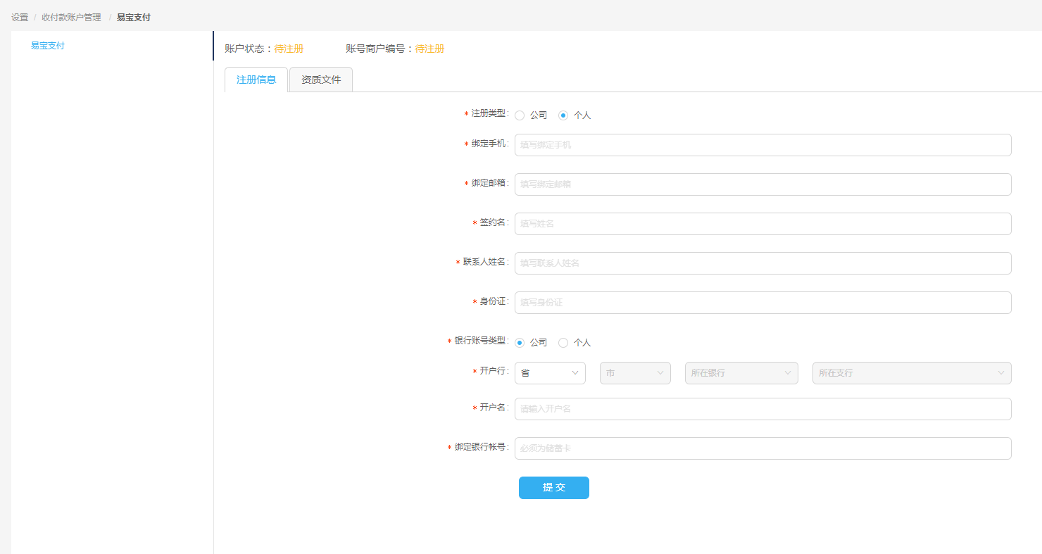 如注册类型为个人,则资质文件上传没有区分