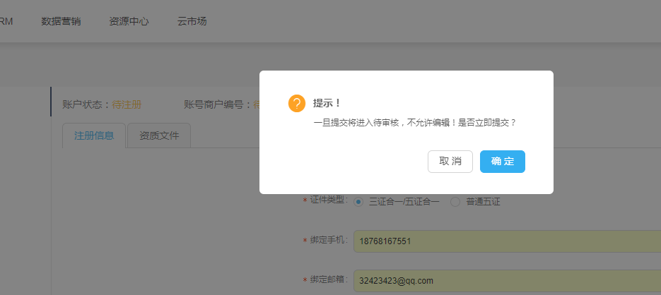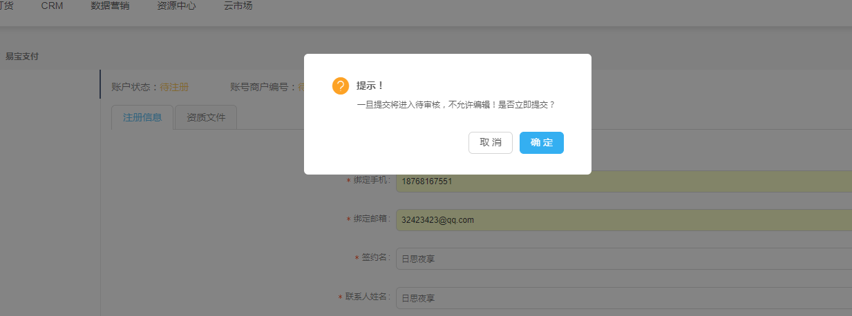 未提交信息时,账户状态为待注册,点击【提交】按钮,弹出确认提示框,提交后状态变为注册信息已提交,待客服审核阶段,不能再进行编辑;如审核未通过,则状态显示客服驳回