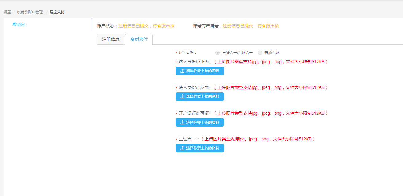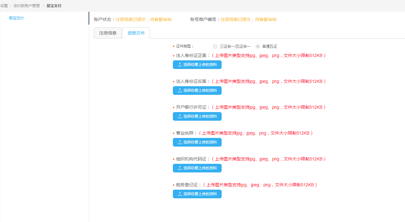 如注册类型为对公,则资质文件上传分三证合一/五证合一和普通五证 三证合一/五证合一