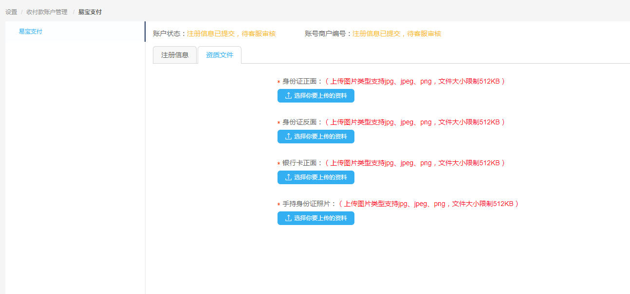 内容名称 类型 必填项 说明 证件类型 单选框 是 自动选中,与注册信息界面选择的证件类型一致 法人身份证正面 附件 是 上传图片类型支持jpg、jpeg、png,文件大小限制512KB 法人身份证反面 附件 是 上传图片类型支持jpg、jpeg、png,文件大小限制512KB 开户银行许可证 附件 是 上传图片类型支持jpg、jpeg、png,文件大小限制512KB 营业执照 附件 是 上传图片类型支持jpg、jpeg、png,文件大小限制512KB 组织机构代码证 附件 是 上传图片类型支持jpg、jpeg、png,文件大小限制512KB 税务登记证 附件 是 上传图片类型支持jpg、jpeg、png,文件大小限制512KB