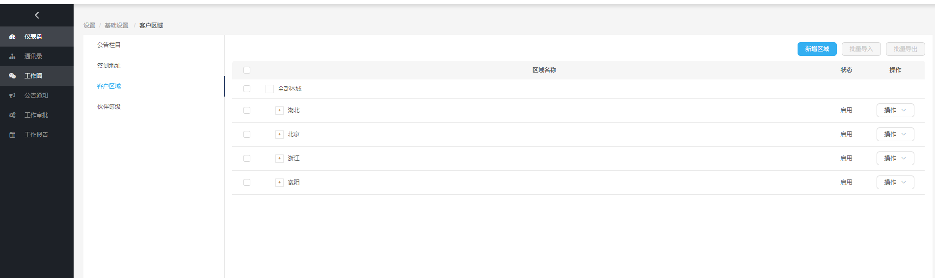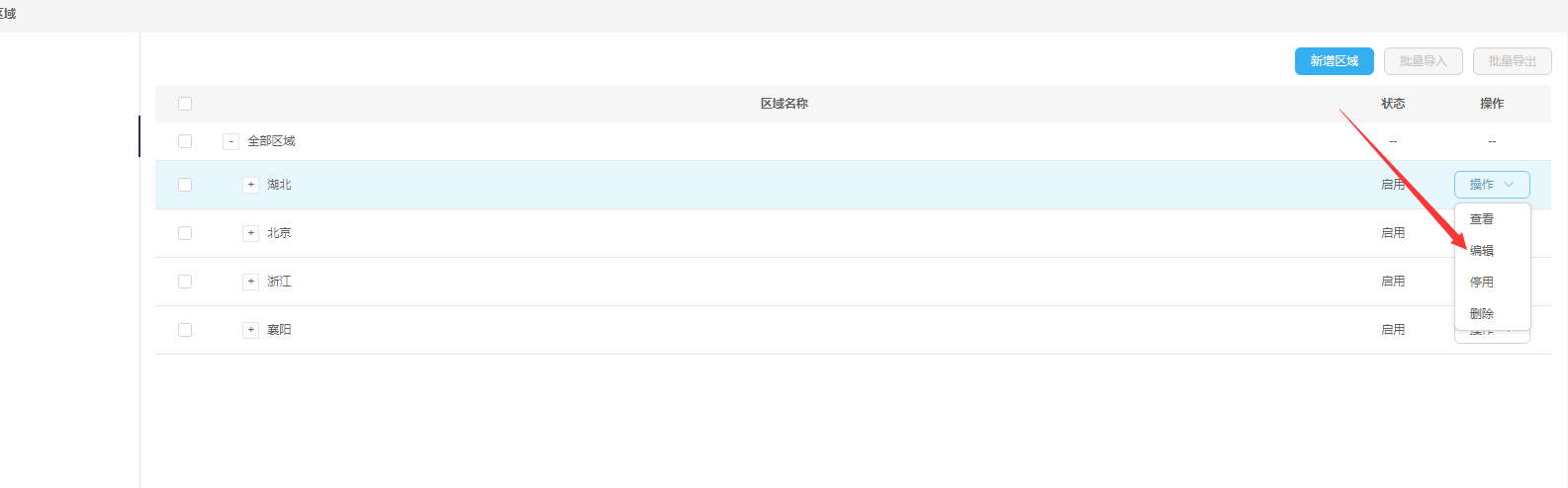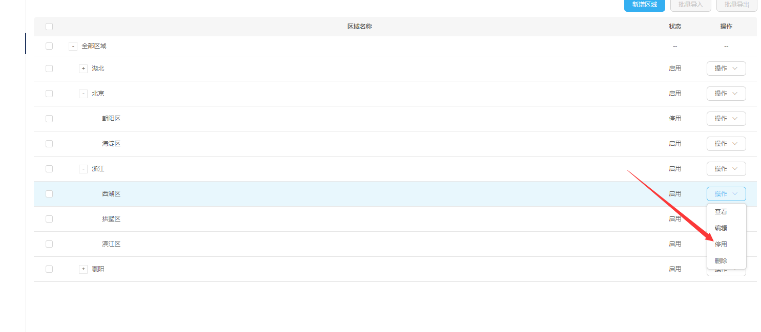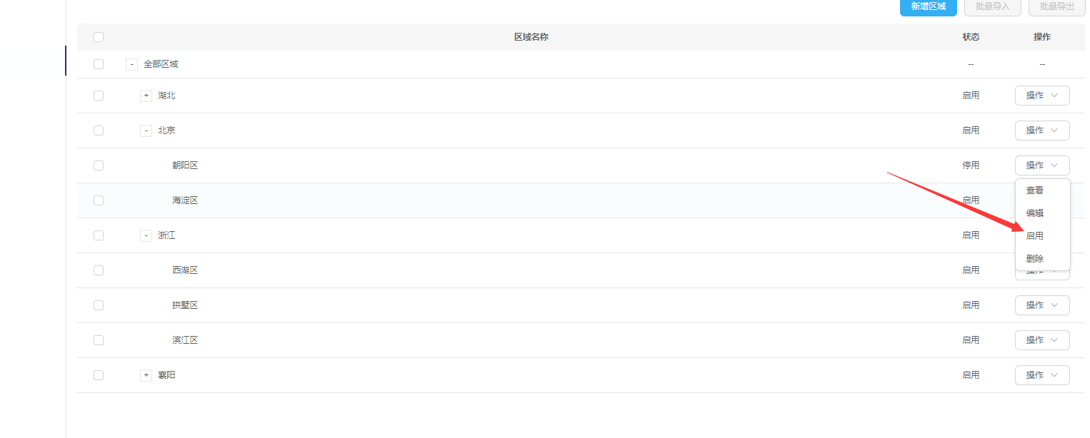 ——点击列表操作列【启用】按钮,区域启用成功,列表中该区域状态变为启用,【启用】按钮变为【停用】