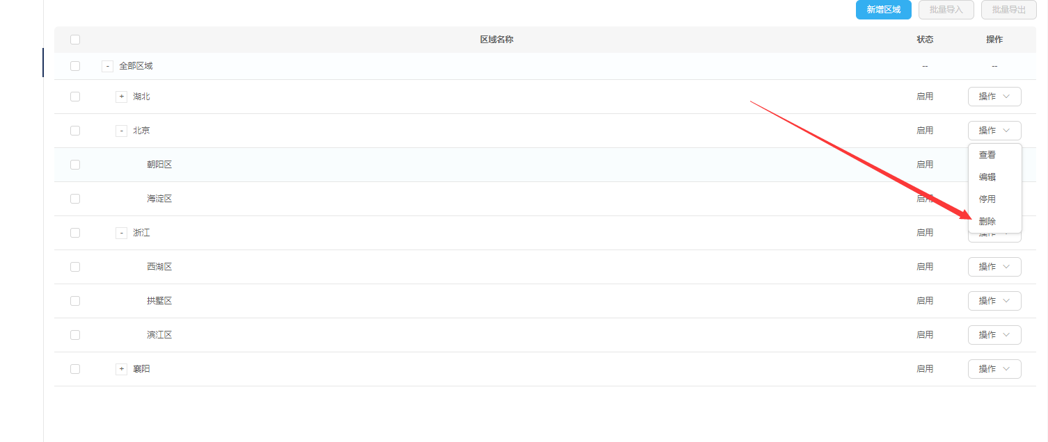 ——如需要删除的区域下有存在下级区域,则无法删除该区域