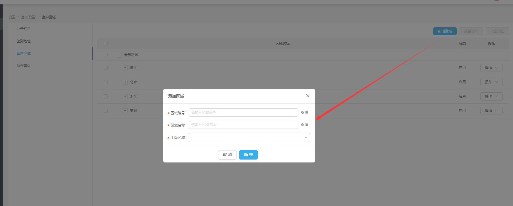 内容名称 类型 必填项 说明 区域编号 文本 是 最多输入16个字符,不能输入重复的区域编号 区域名称 文本 是 最多输入10个字符,不能输入重复的区域名称 上级区域 文本 是 点击下拉键,选择上级区域,如选择全部区域,则新增的区域为一级区域;不能选择三级区域,区域级别最多三级 ——所有内容输入完成后,点击确定按钮,区域新增成功,区域列表中新增该区域,新增的区域默认状态为启用;点击取消按钮,区域未添加