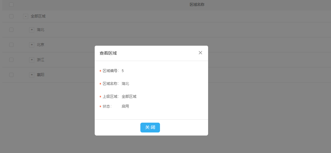 ——点击列表操作列【查看】按钮,弹出查看区域界面,界面显示该区域编号、名称、上级区域及状态信息,不可修改,点击关闭按钮,查看界面消失