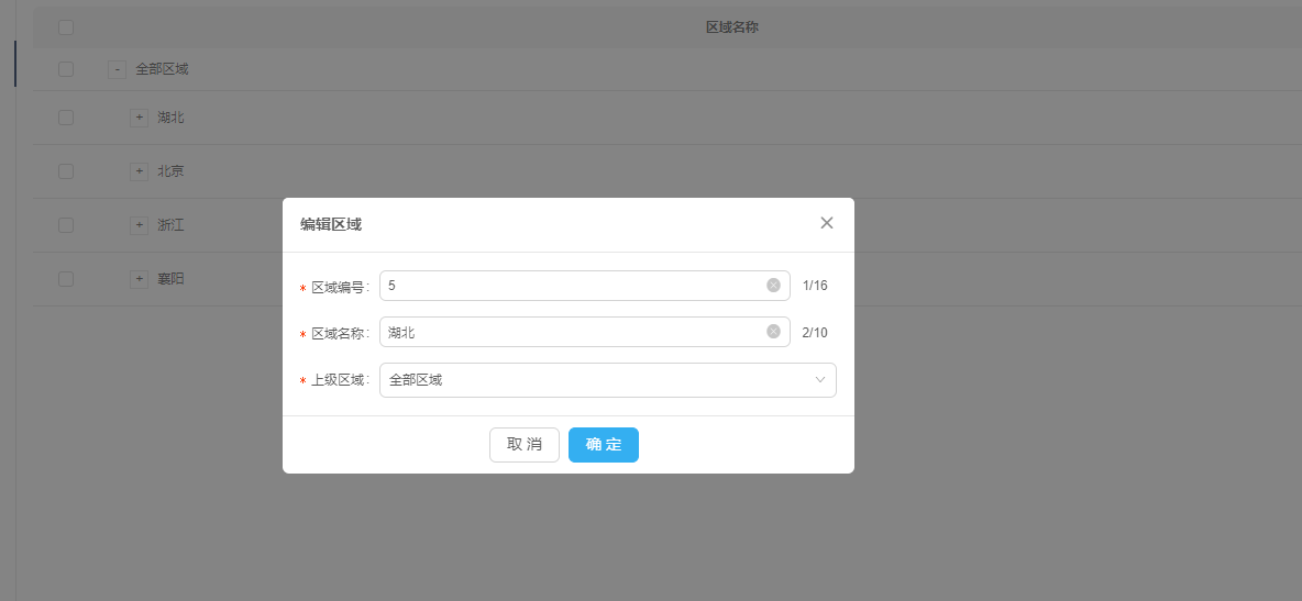 ——编辑区域时上级区域不能选择当前编辑的区域及其下级区域,不能选择停用状态的区域