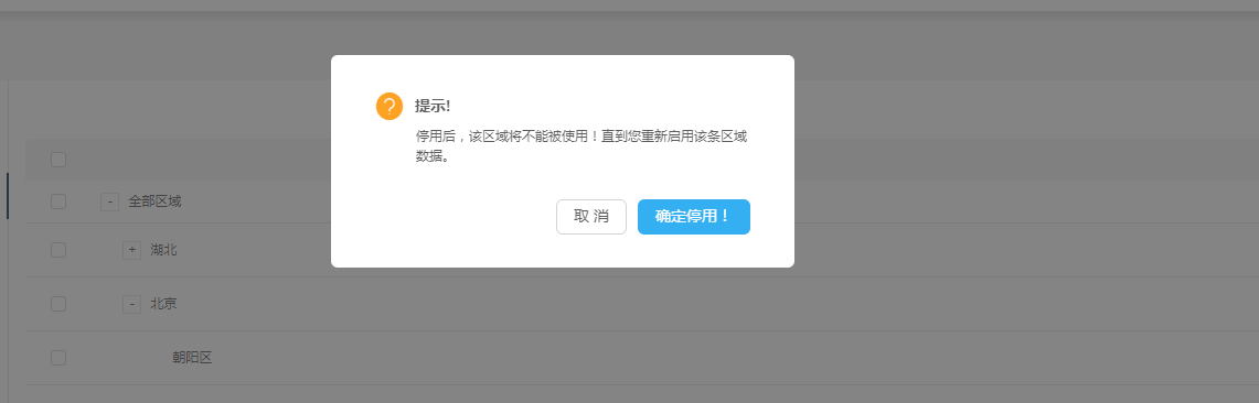 ——点击列表操作列【停用】按钮,弹出停用区域确认框,点击确定停用,区域停用成功,列表中该区域状态变为停用,【停用】按钮变为【启用】;点击取消按钮,区域未停用,确认框消失