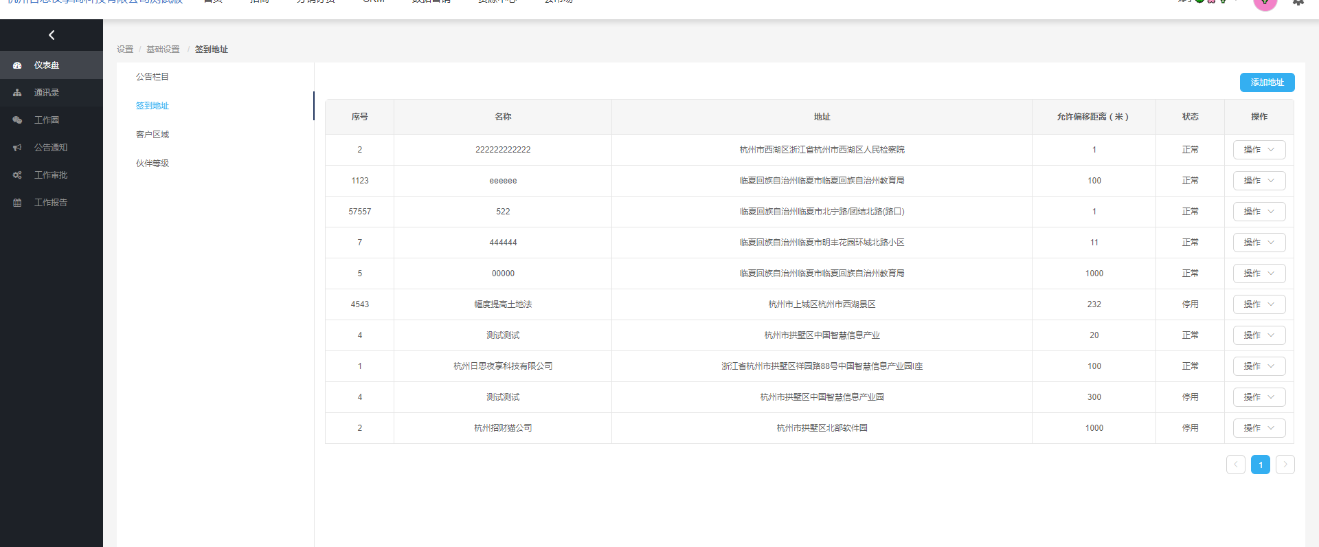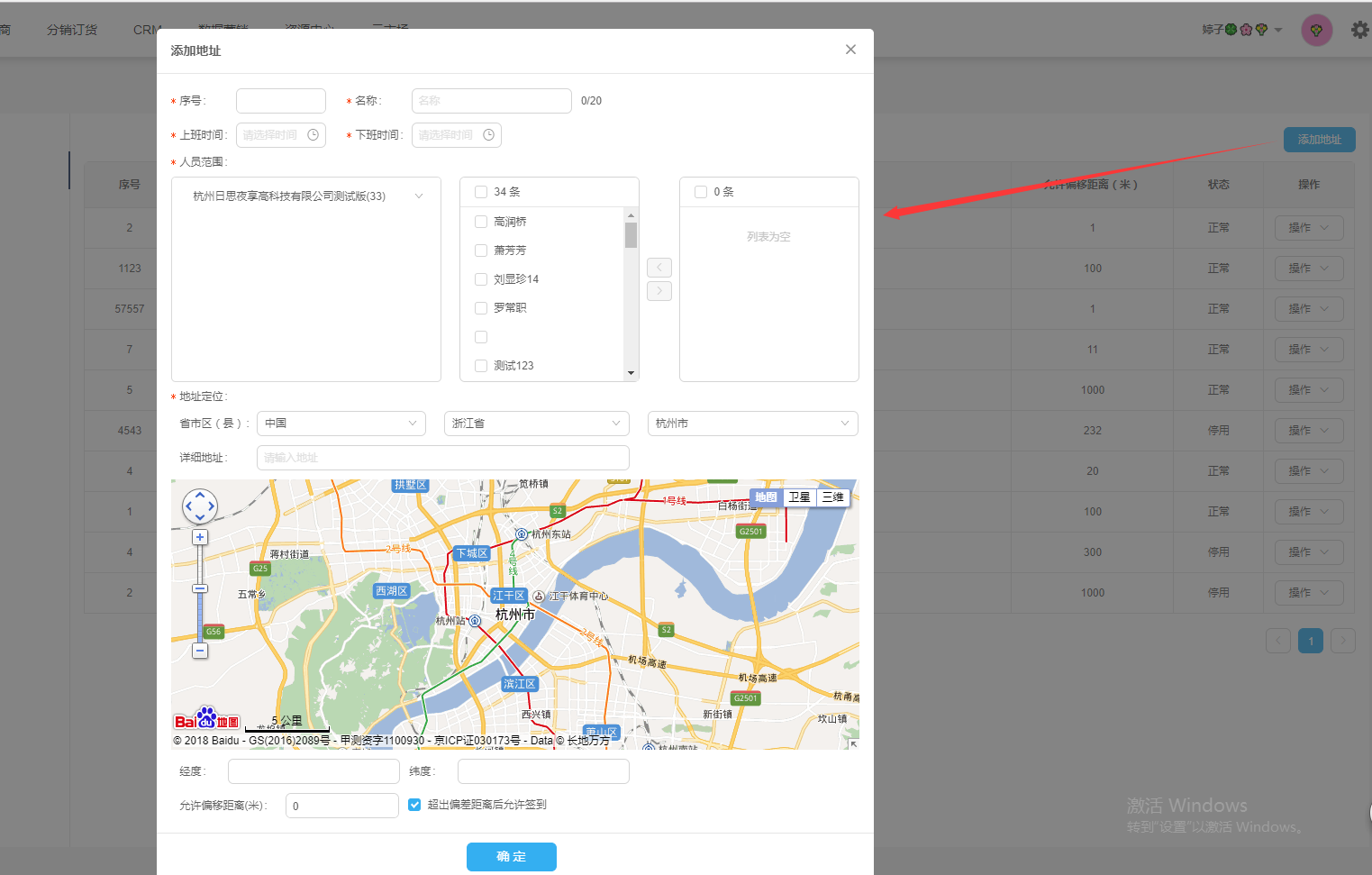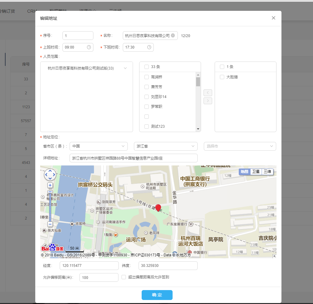 内容名称 类型 必填项 说明 序号 文本 是 只能输入1-99999999的整数 名称 文本 是 最多输入20个字符 上班时间 文本 是 点击点击输入框,自动弹出时间控件 下班时间 文本 是 点击点击输入框,自动弹出时间控件 人员范围 复选框 是 人员范围是必填项,可选择多个人员 省市区 文本 是 省市区是必填项 详细地址 文本 是 详细地址是必填项,输入后地图也会显示对应区域 经度 文本 是 经度为必填项,保留小数后6位 维度 文本 是 纬度为必填项,保留小数后6位 允许偏移距离 文本 是 只能输入1-99999999的整数 超出偏差距离后允许签到 选择框 是 勾选是否同意该项 ——所有内容输入完成后,点击确定按钮,地址新增成功,地址列表中新增该地址,新增的地址默认状态为正常;点击取消按钮,地址未添加