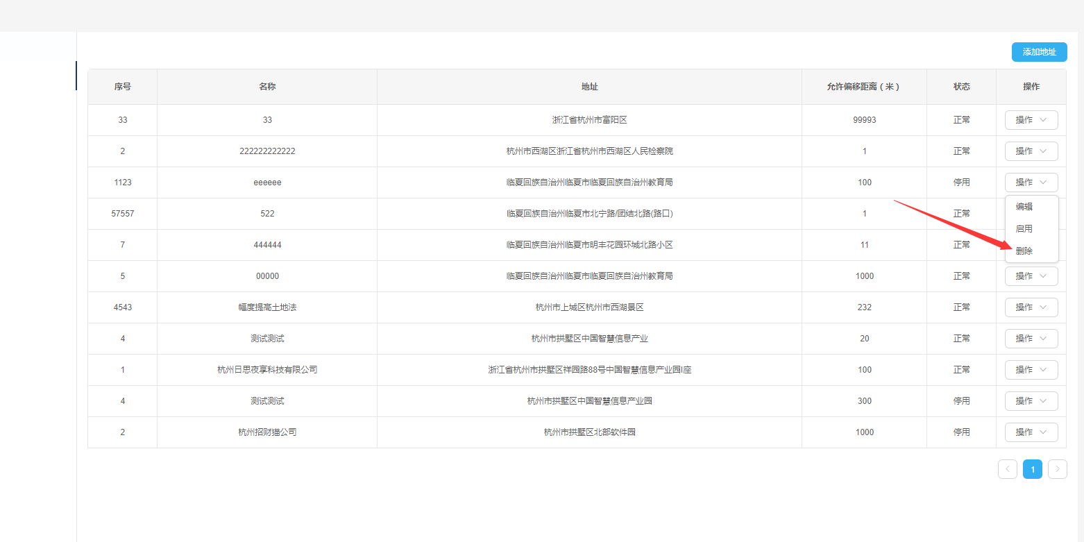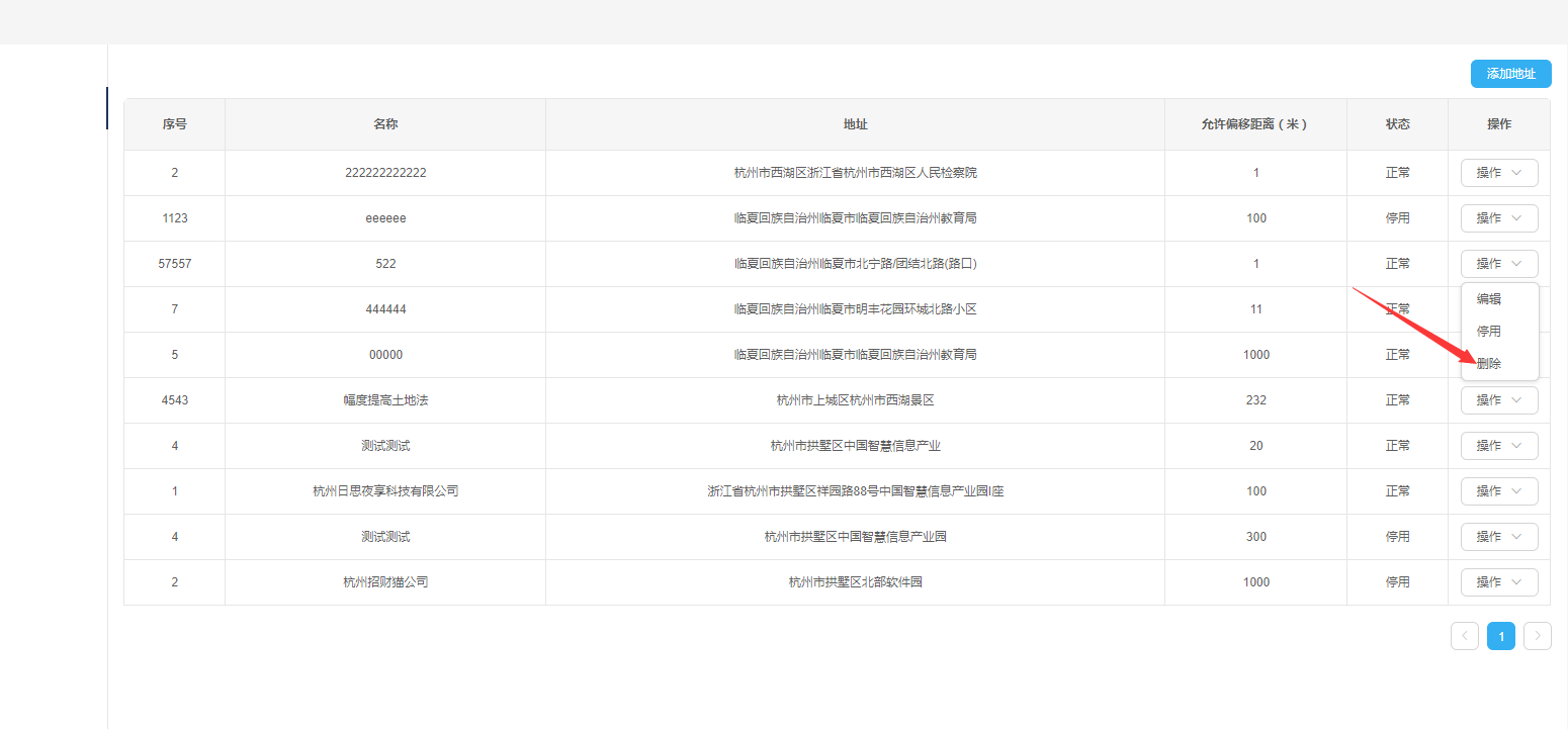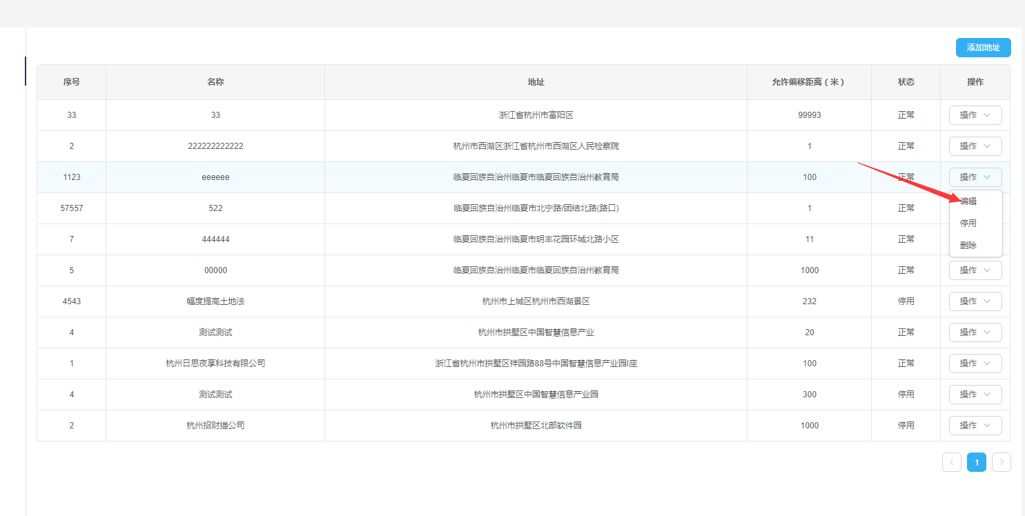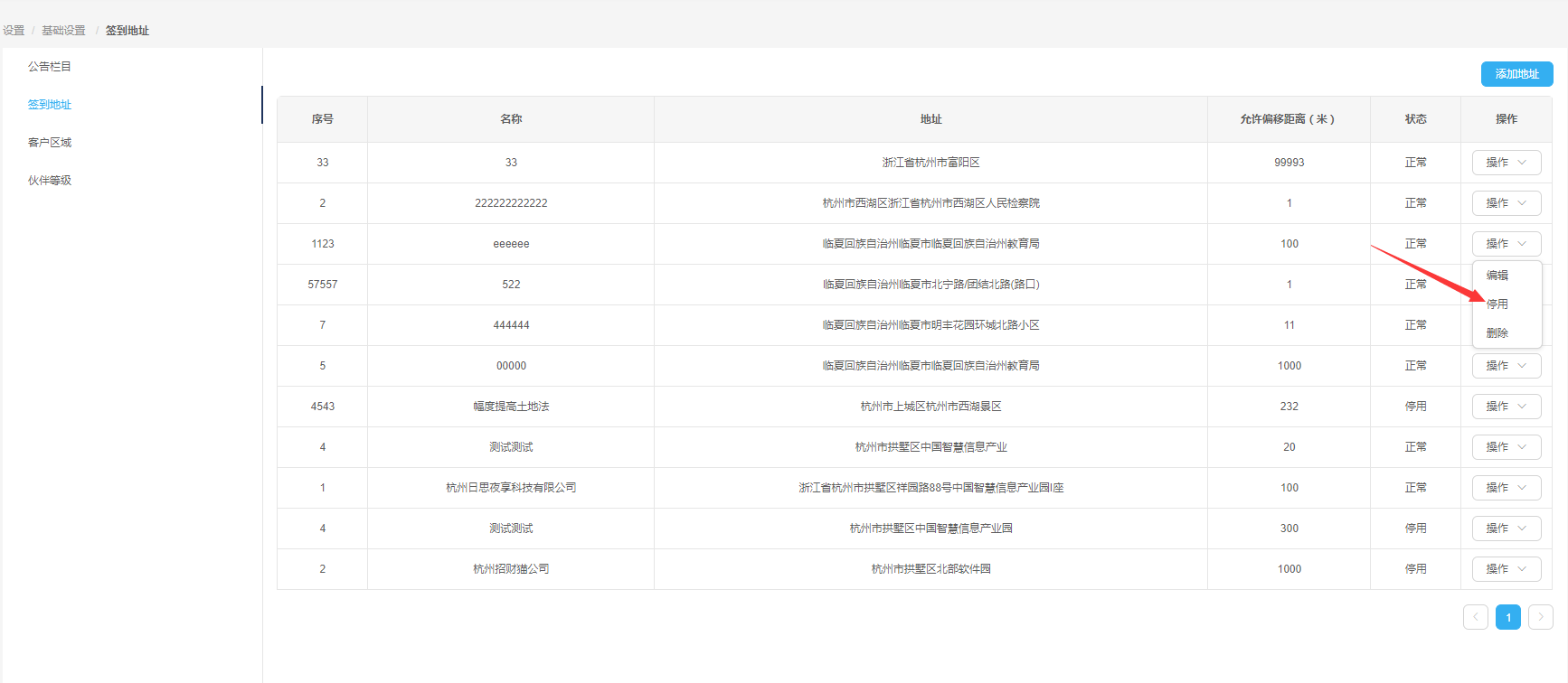 ——点击列表操作列【停用】按钮,弹出停用成功提示信息,地址停用成功,列表中该地址状态变为停用,【停用】按钮变为【启用】