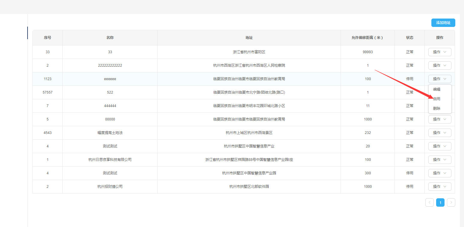 ——点击列表操作列【启用】按钮,弹出启用成功提示信息,地址启用成功,列表中该地址状态变为正常,【启用】按钮变为【停用】