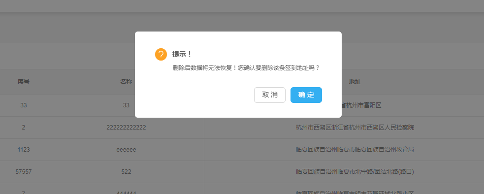 ——点击列表操作列【删除】按钮,弹出删除确认框,点击【确定】,地址删除成功,列表中该地址不再存在;点击【取消】,删除确认框消失,地址未删除
