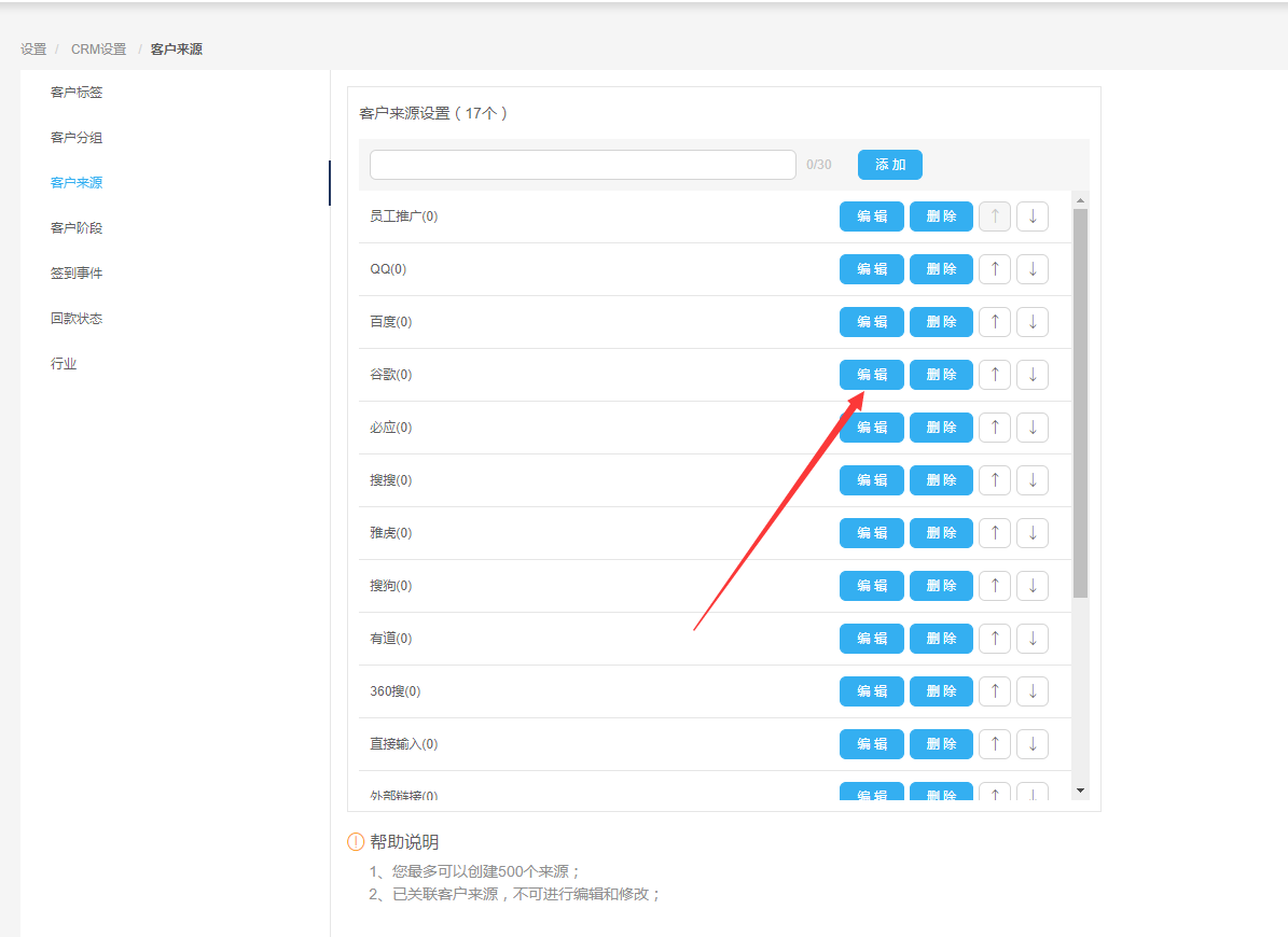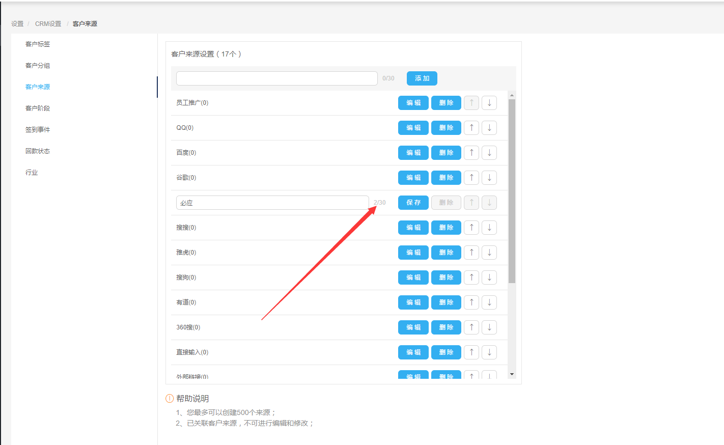 ——点击列表操作列【编辑】按钮,该来源框变为输入框,原先客户来源的信息显示在界面中,编辑功能与新增功能雷同,详见 新增客户来源
