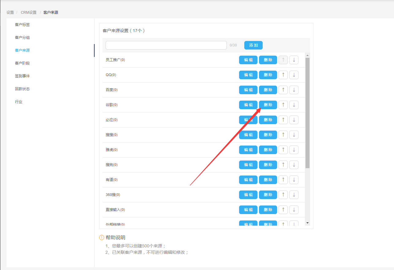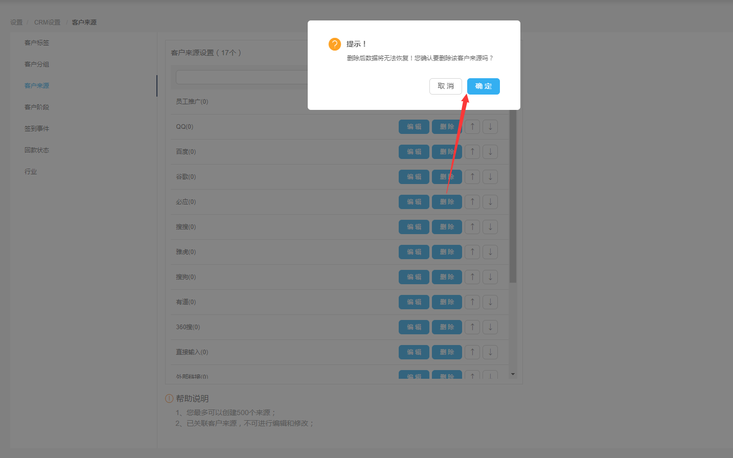 ——点击列表操作列【删除】按钮,弹出删除确认框,点击【确定】,客户来源删除成功,客户来源列表中该客户来源不再存在;点击【取消】,删除确认框消失,客户来源未删除