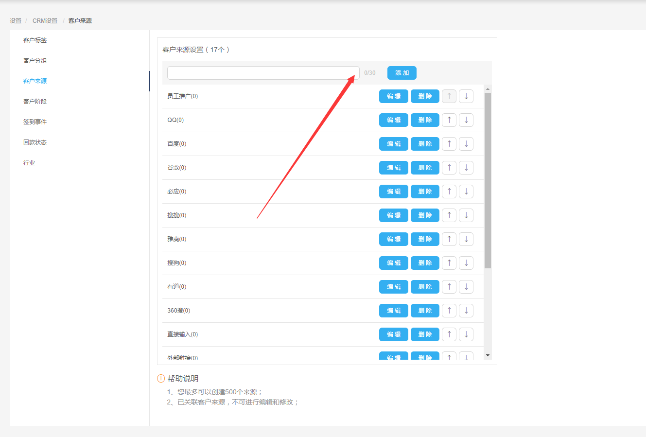 ——点击列表操作列【向上移动箭头】或【向下移动剪头】按钮,客户来源做相应的移动