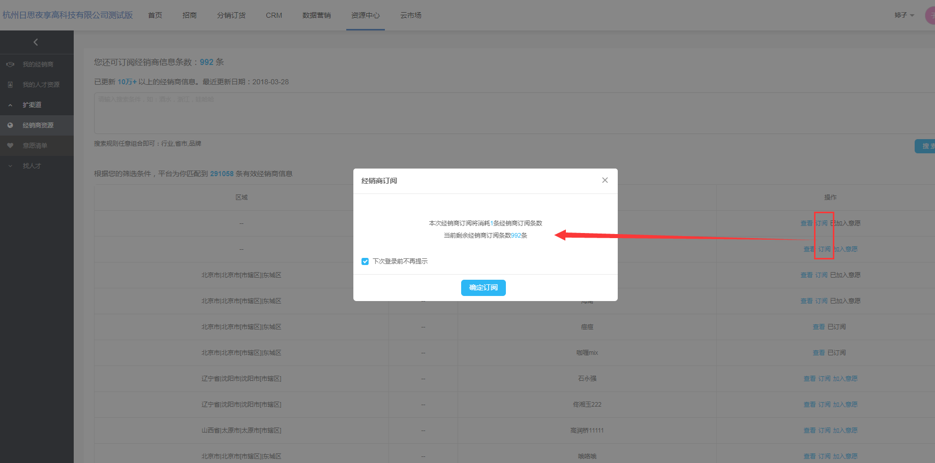 在经销商资源列表,在经销商未被订阅时,点击操作栏【订阅】按钮,弹出订阅的提示框,