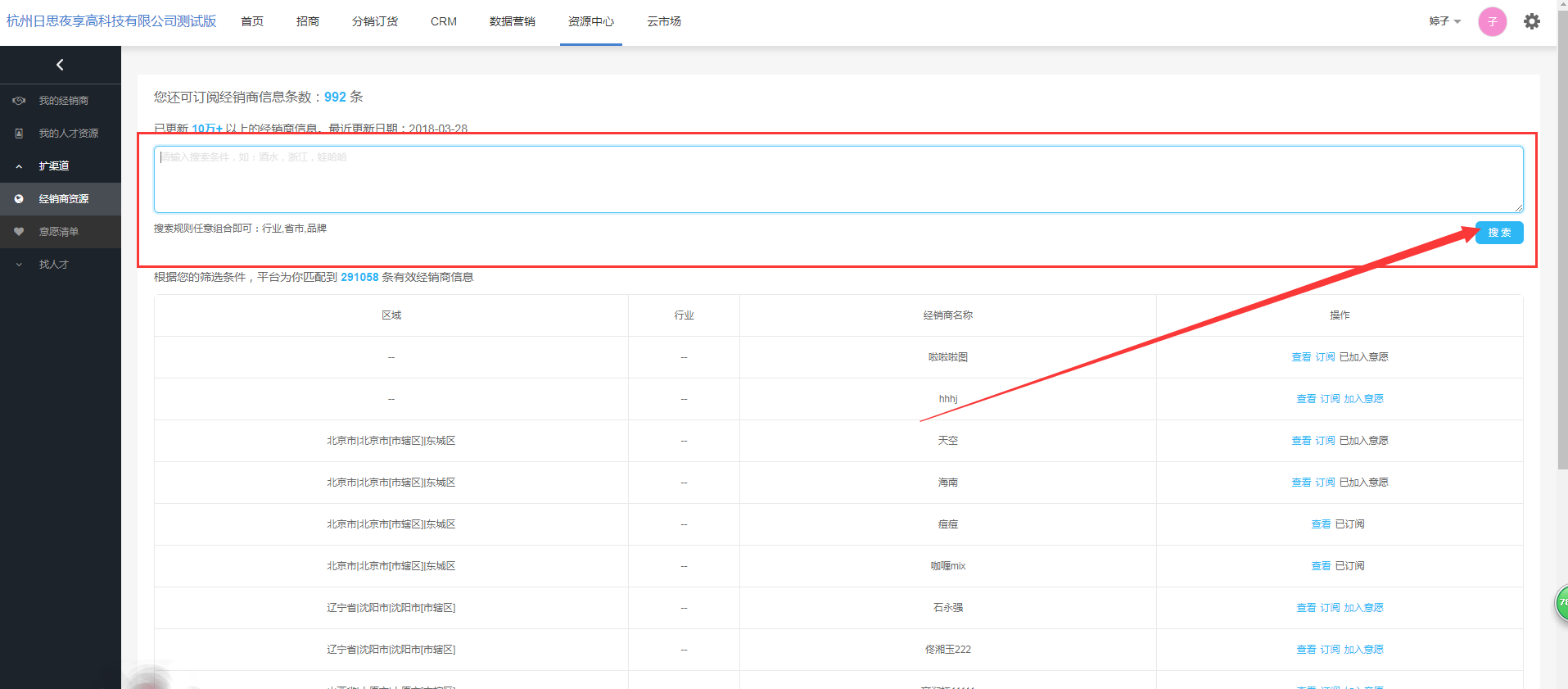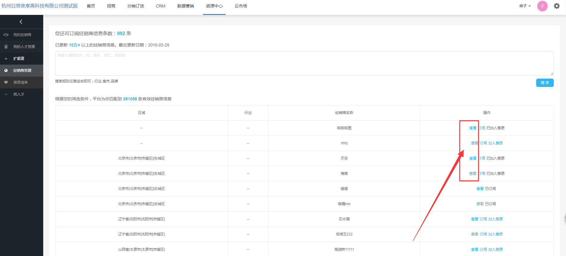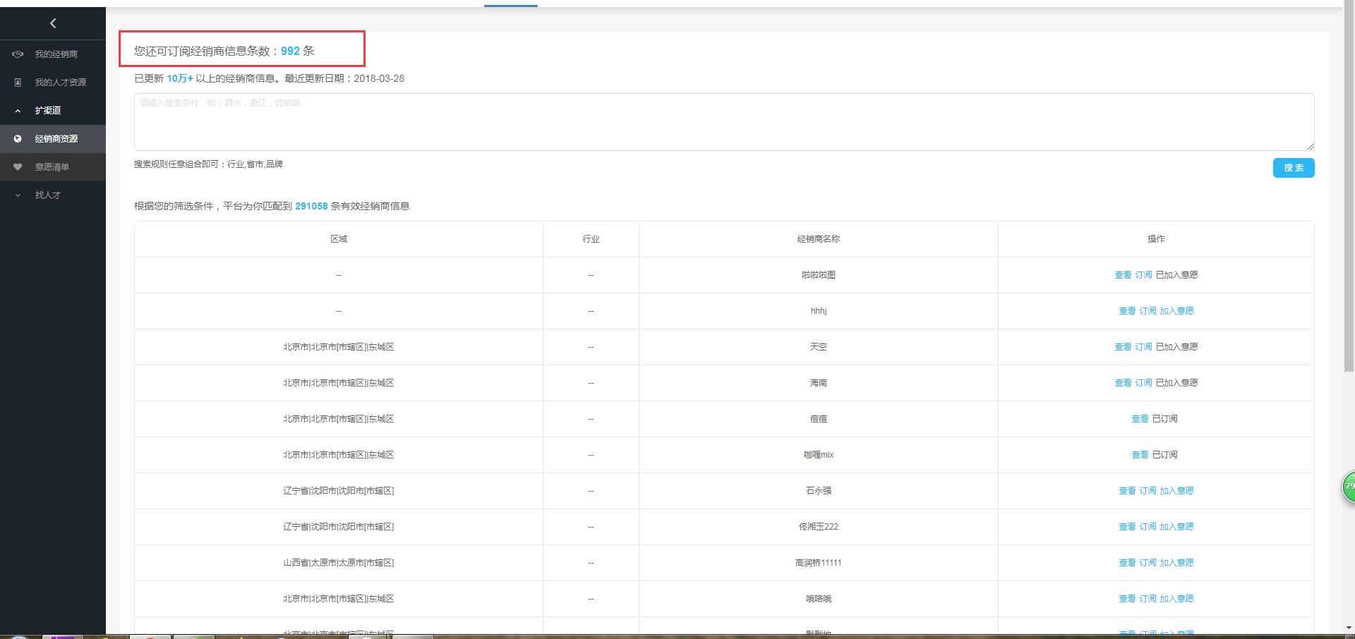 主要对经销商库进行管理,从扩渠道 > 经销商资源操作栏里订阅的经销商数据,会同步到数据营销>联系人和资源中心>我的经销商列表中。