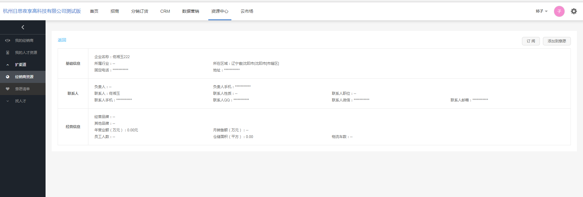 备注:若经销商还未被订阅,查看详情时,经销商的主要信息,如手机号,地址,qq,邮箱等以“*”隐藏表示。 若经销商已被订阅过,经销商的信息全部正确展示。 点击左上角【返回】按钮,返回至经销商资源列表。