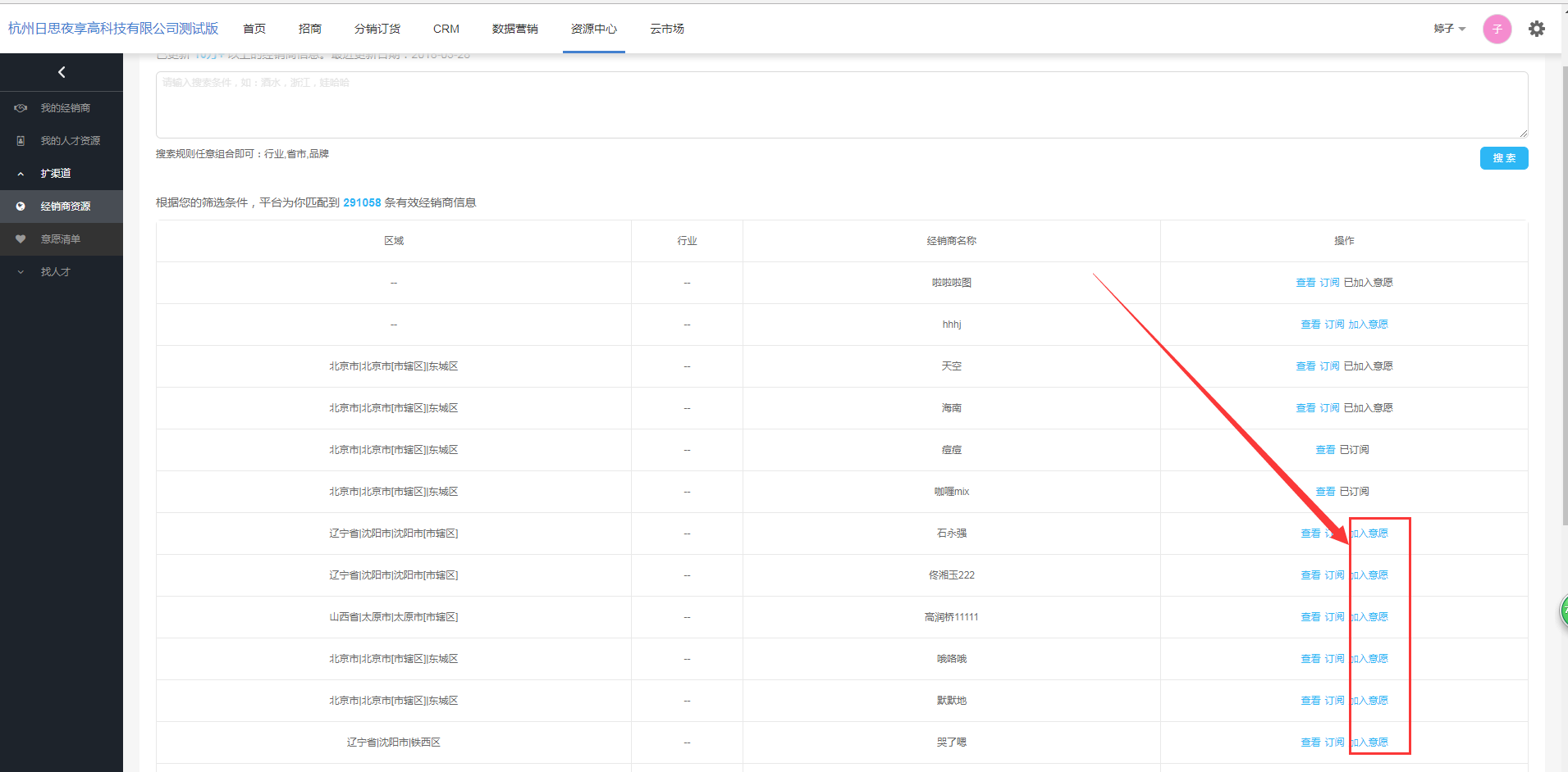 备注:当可订阅的经销商条数不足时,需到云市场-服务订购界面充值够买,且当经销商已被订阅,操作栏不再显示【加入意愿】按钮。