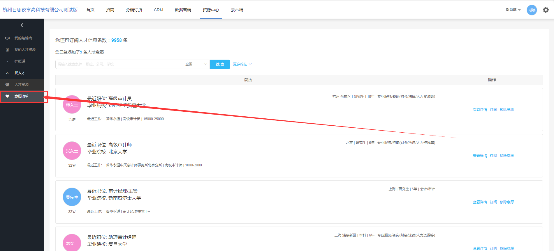 按钮点击后,人才信息从意愿清单列表成功移除,数据重新添加到“资源中心>我的人才资源”列表,可从“资源中心>我的人才资源”列表操作栏重新加入意愿。