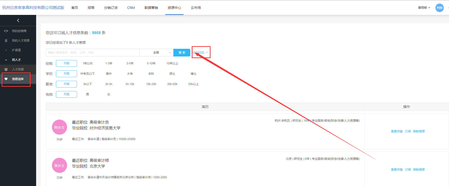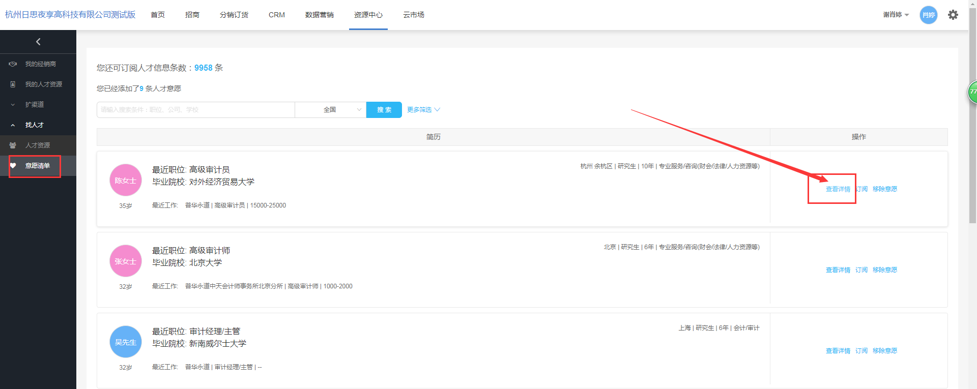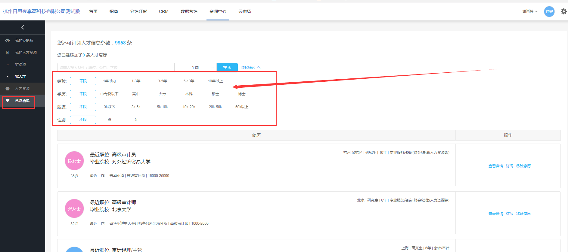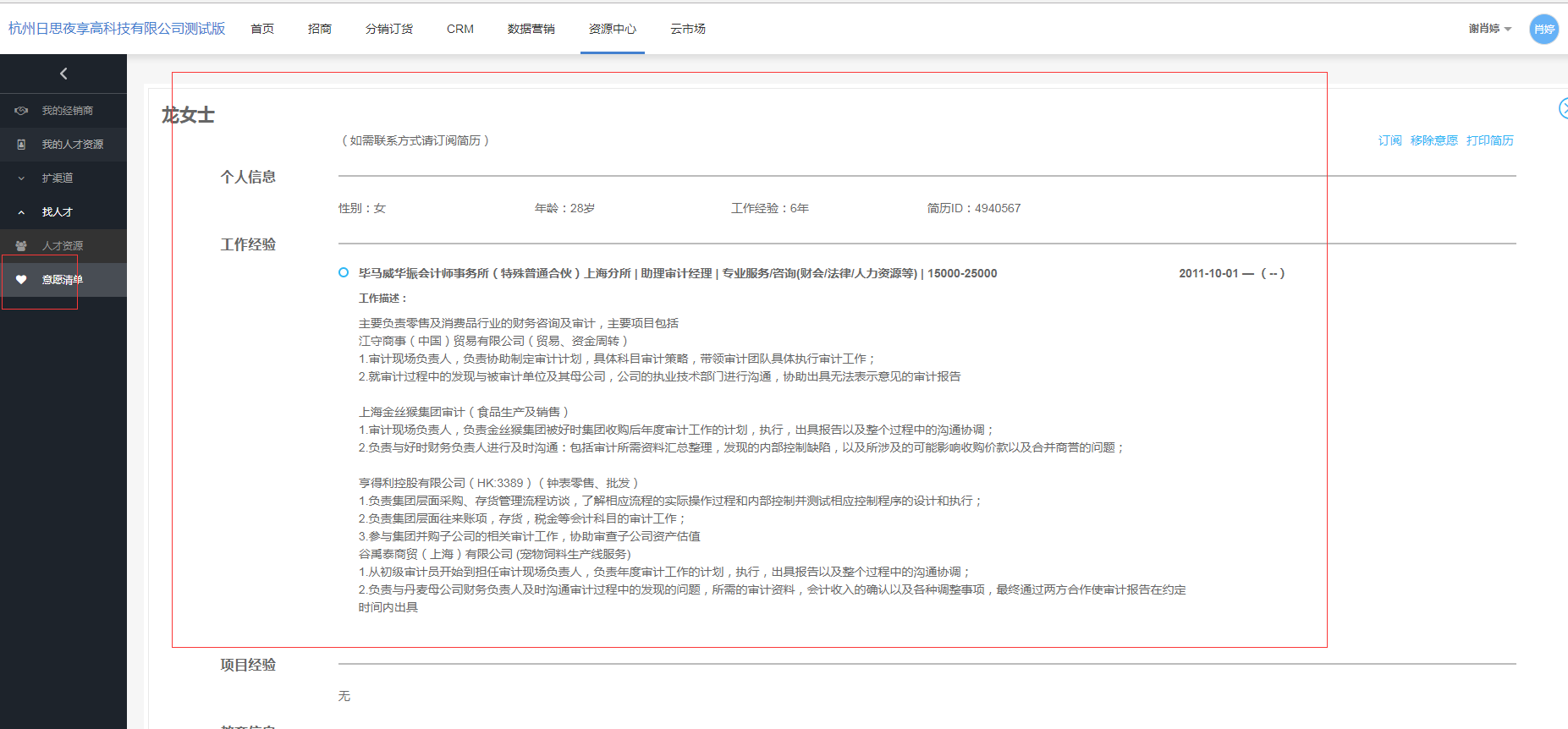 主要展示:将有兴趣的人才信息,加入到我的意愿清单里。