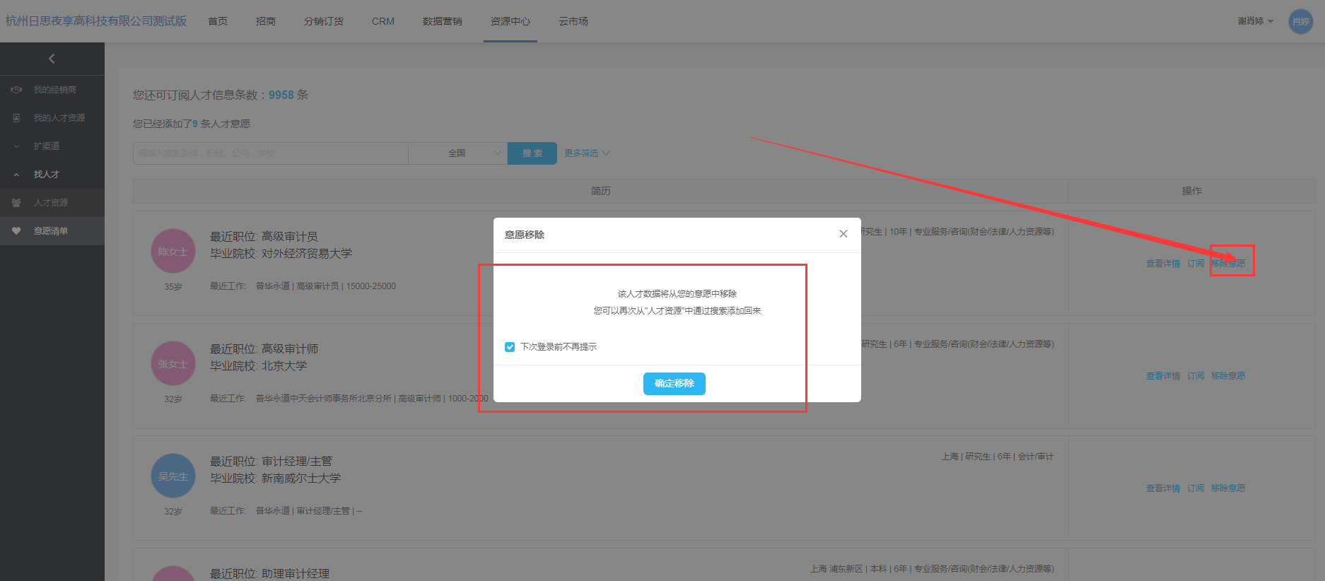 在意愿清单列表,当人才信息未被加入意愿时,点击操作栏【移除意愿】按钮