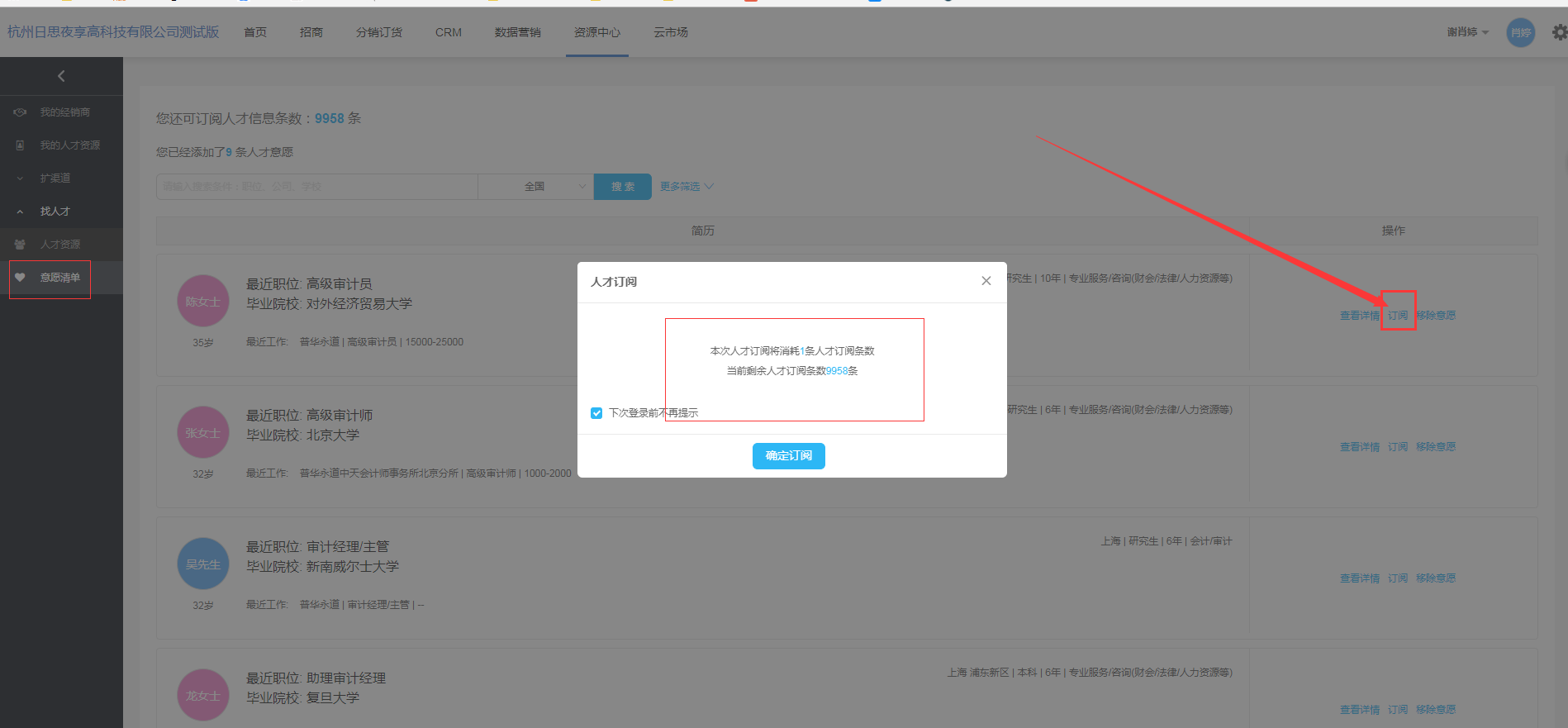 在意愿清单列表,在人才信息未被订阅时,点击操作栏【订阅】按钮,弹出订阅的提示框: