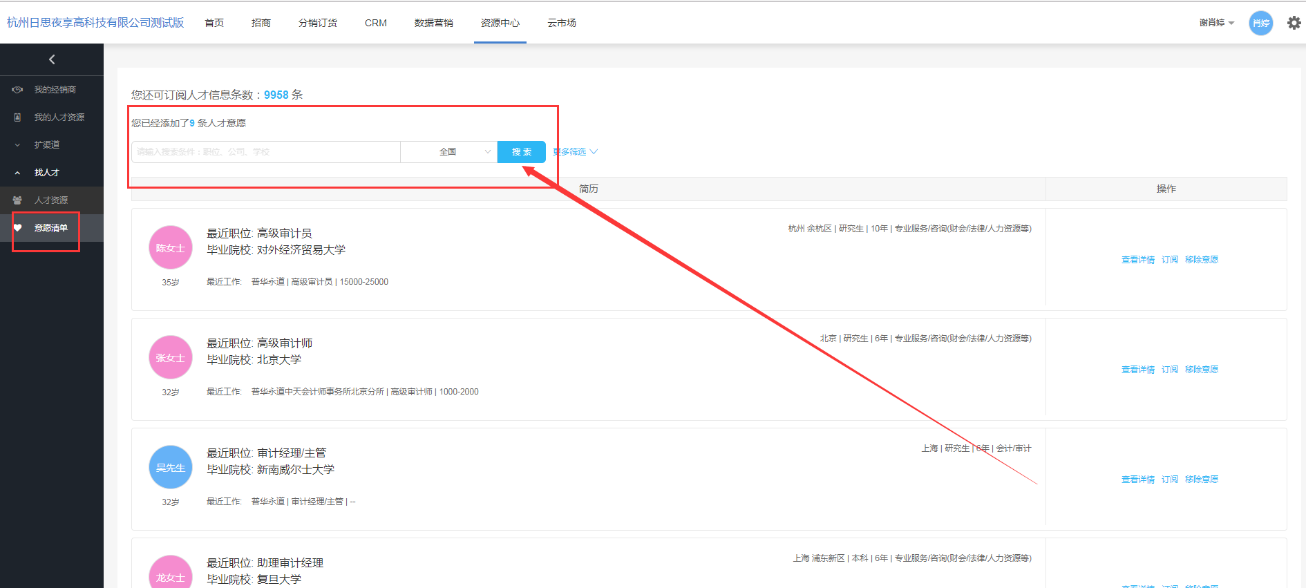 - 可根据人才的职位,公司,学校,城市(默认显示“全国”,展示全国的我的人才意愿信息)点击【搜索】按钮,进行精确搜索。