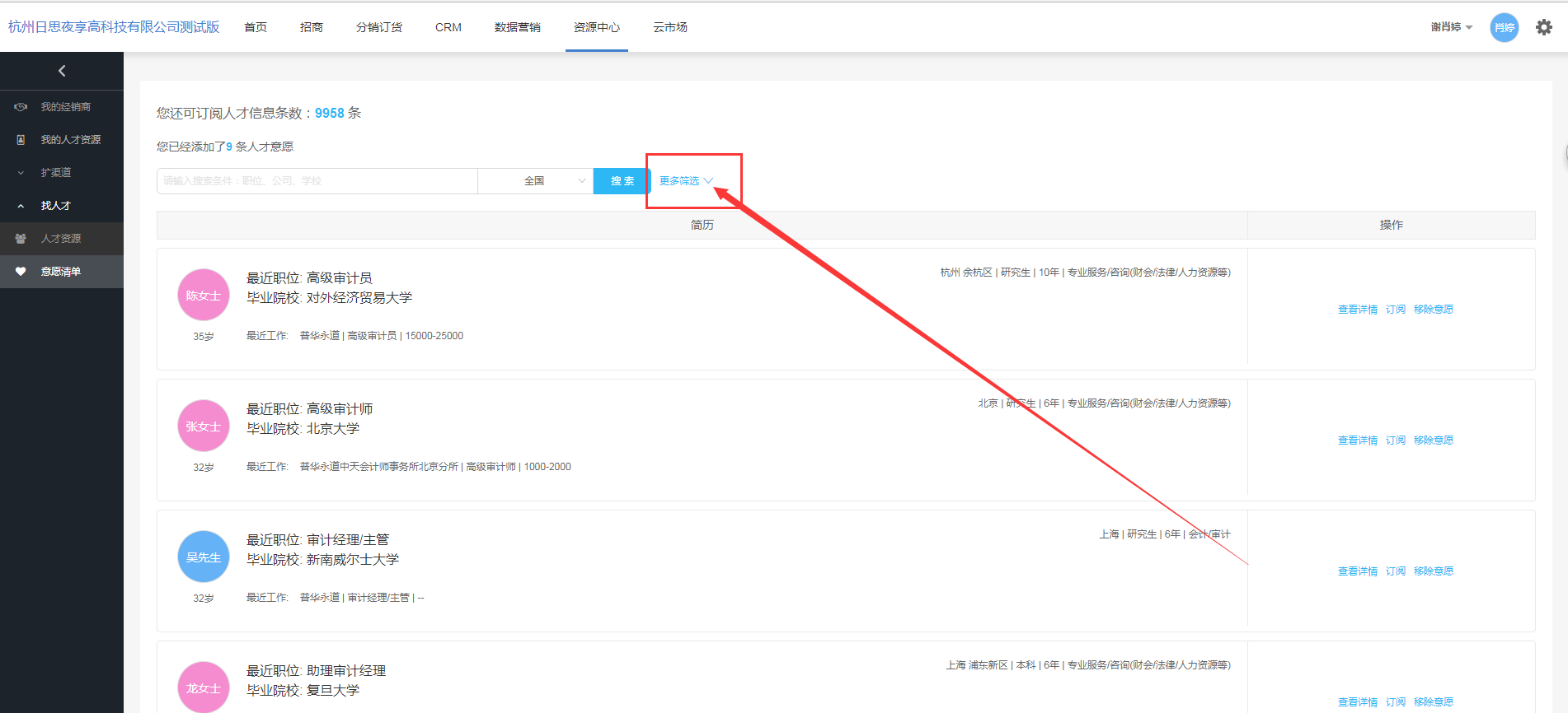 【备注:当可订阅的人才信息数条数不足时,需到云市场-服务订购界面充值够买。】