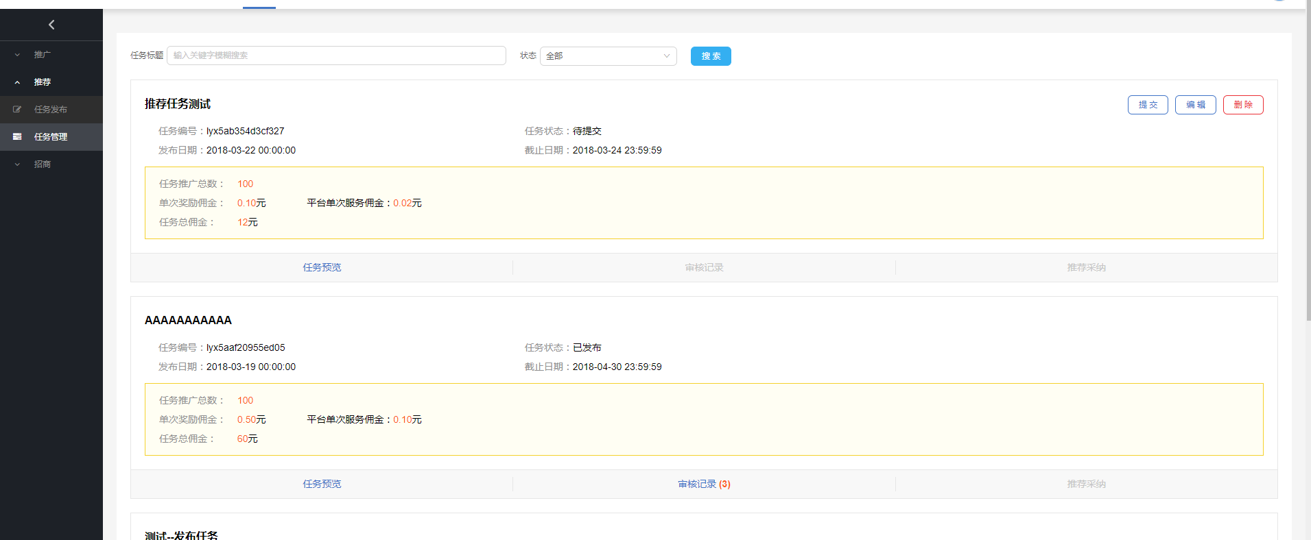 编辑-功能说明 待提交、已驳回、状态的任务有待【编辑】按钮,推广任务编辑功能与任务发布雷同,详见推荐任务发布