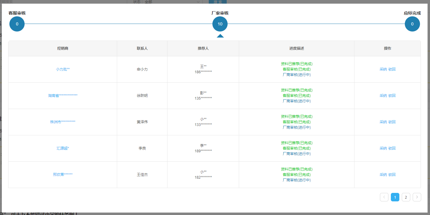已推荐客服已通过审核的经销商显示在厂商审核阶段,厂商可进行采纳或驳回操作